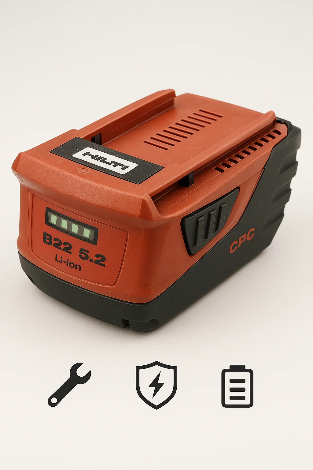 Der Hilti B22 Akku ist mit neuen, hochstromfähigen Zellen Samsung INR18650-25R ausgestattet. Dank einer Kapazität von 5200 mAh und einer Entladestromstärke von bis zu 50 A sorgt er für stabile Energieversorgung – auch bei intensiver Nutzung.
